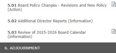 The board agenda is provided. Please be aware that the agenda could change prior to the board meeting.