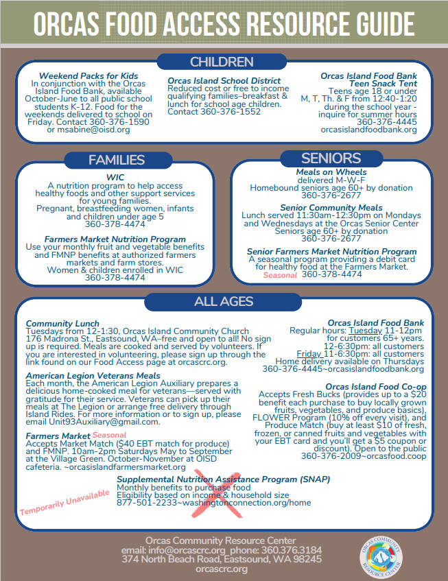The Orcas Food Access resource guide outlines similar benefits as the San Juan Island guide, including weekend packs for kids and the teen snack tent, both from the Orcas Island Food Bank, Farmer’s Market Nutrition program, Senior Community Meals on Mondays and Wednesdays at the Orcas Senior Center, and Community Lunches for all at Orcas Island Community Church on Tuesdays. The complete guide can be found on the county’s food access webpage and on the Journal’s website at https://www.sanjuancountywa.gov/DocumentCenter/View/33730/Orcas-Food-Access-Resource-Guide.