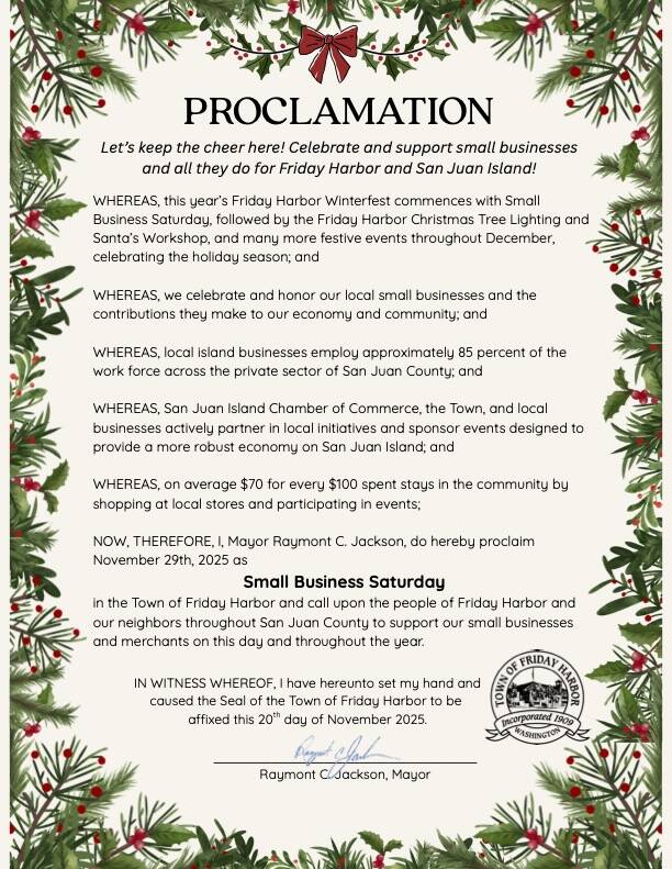 In honor of small businesses, and just in time for the holiday season, during the regular Town Council meeting on Nov. 20, the Town of Friday Harbor Mayor Ray Jackson proclaimed Nov. 29 as Small Business Saturday.
