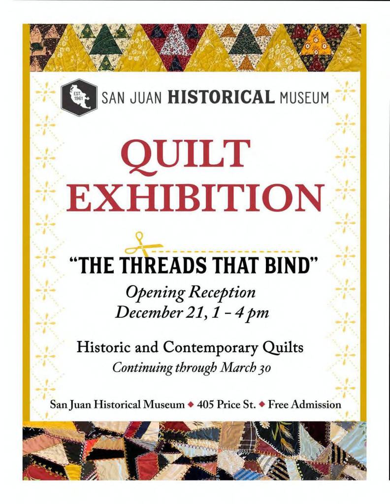 The San Juan Historical Museum is proud to announce the opening of our quilt exhibition, “The Threads that Bind.” From the signed and dated Crazy Quilts of the late 1800s to the striking art quilts of today, we celebrate the evolution of women’s craft that celebrates the evolution of quilts for home and hearth, utility and artistic expression.