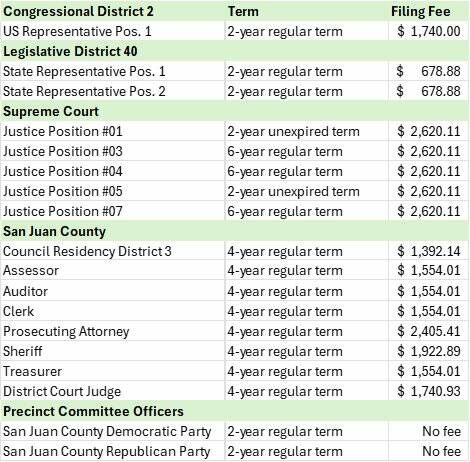 During filing week, candidates may submit their filings online, by email, by fax or in person at the San Juan County Elections Office at 55 Second St., Suite A, Friday Harbor. Online candidate filing will be available Monday, May 4, at 8 a.m. through Friday, May 8, at 5 p.m.