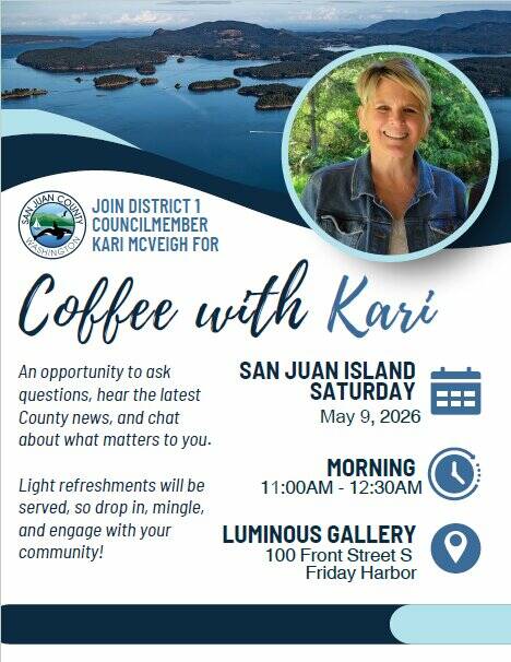 McVeigh hosted these open-house style meetings last year and is continuing the tradition into 2026. The second ‘Coffee with Kari’ of the year will take place on San Juan Island on May 9 from 11-12:30 a.m. at the Luminous Gallery in Friday Harbor.