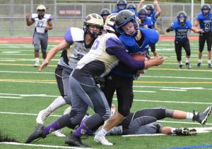 Wolverine Brian Wolf (26) and Connor Haines (29) tackle a Viking pass receiver. <em>(John Simpson/Contributed photo)</em>