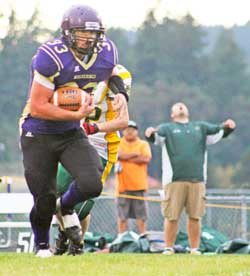 Frustration mounts on the Darrington sideline (Loggers coach in green)as Friday Harbor running back Kai Herko eludes tacklers on a long run from scrimmage.