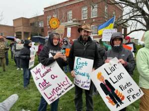 A group of approximately 50 protestors gathered with signs and upside-down flags at the entrance to American Camp…