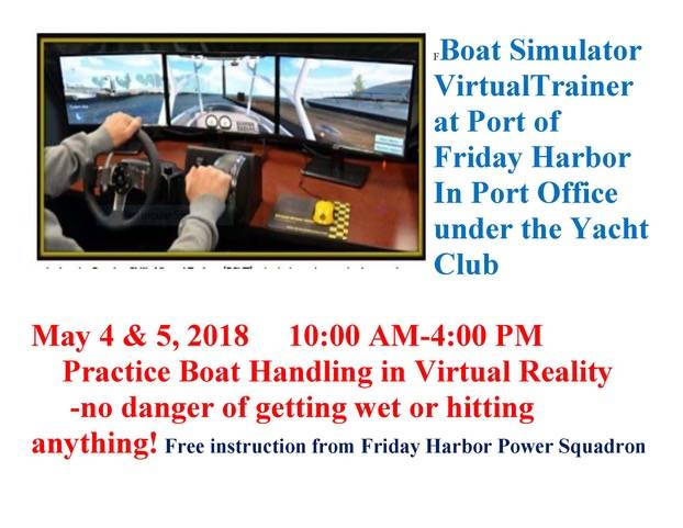 From 10 a.m. to 4 p.m., on May 4 and 5, there will be a boat simulator virtual trainer at the Port of Friday Harbor office, located underneath the yacht club. Participants can practice boat handling in virtual reality, without the dangers of getting wet or hitting anything.