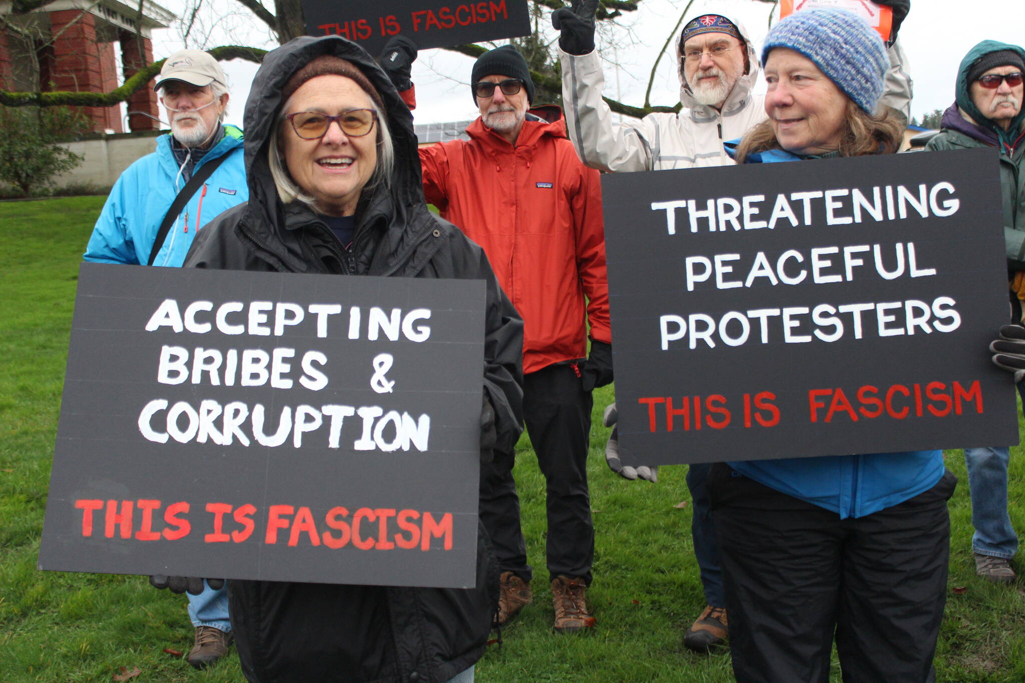 It didn’t matter if it was drizzling or raining or how gray the sky was. Over 50 people turned out in what Indivisible San Juan Island called an “Emergency Pop-up” protest at the courthouse Jan. 6.