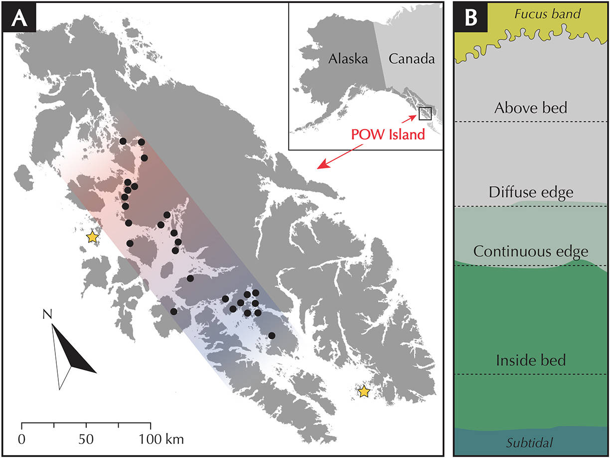 Thus, I shifted the focus of my research to zonation within an eelgrass site and investigated whether there is a relationship between bioturbation by sea otters and the upper (landward) extent of eelgrass beds. This work reminded me of intertidal research that I participated in as a technician at FHL with Dr. Megan Dethier (2009), where we used survey equipment to collect tidal elevation data that were used to address several ecological questions. I selected 26 sites across a gradient of sea otter presence on POW Island. At each site, my team and I measured the tidal elevation of the continuous and diffuse edges of eelgrass beds along 100-meter transects — the continuous edge is where the bulk of the eelgrass stops growing and the diffuse edge is a band of low-density eelgrass growing just above the bulk. We also quantified the density of sea otter pits along three 100 meter transects (inside the bed, at the continuous edge and above the bed). The work required swiftness; learning how to cram just the right number of tasks within a low tide window — no more, no less — was challenging!