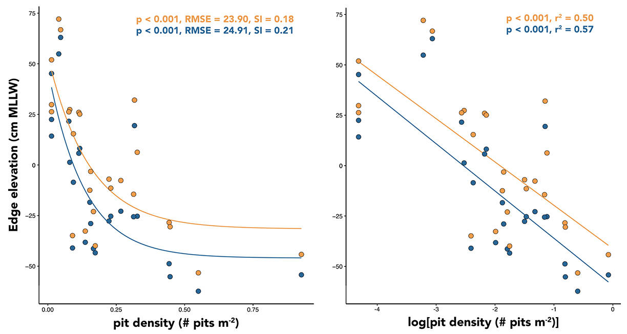 After a long season, a dataset was born. The data suggested a strong negative correlation between bioturbation (pits per meter squared) and the elevation of the upper edge of eelgrass beds. The non-linear relationship suggests that the rate of change is strongest in sites transitioning from low to moderate disturbance activity. These data, along with personal observations of sea otter behavior, supports the notion that digging activity by sea otters has the capacity to quickly reduce the upper extent of eelgrass habitat. When the data are categorized into sites of Low and High sea otter disturbance, the mean elevation of the continuous edge of eelgrass in Low-otter sites is +0.16 m (MLLW) versus -0.41 m (MLLW) in High-otter sites, a difference of 0.57 meters in elevation. Considering the mean beach slope at these sites, the loss of 0.57 meters in zonation equates to the loss of approximately 9 meters squared of horizontal eelgrass per meter of shoreline.