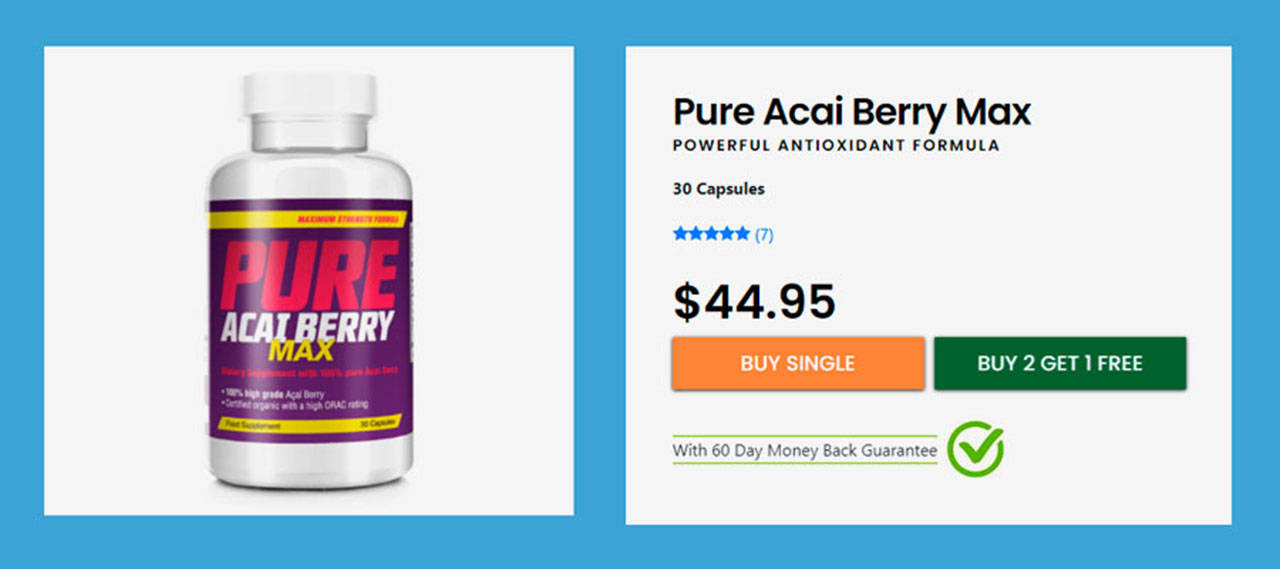 Buyers can order these supplements online from the official company website, offering a 60 Day Money Back Guarantee. The products aren’t available in any other online store or website, so if you don’t want to be duped, head to the company’s official website to place your order, where a single bottle of Pure Acai Berry Max can be purchased for $44.95, or buy two for the price of $89.90 and get one bottle free.