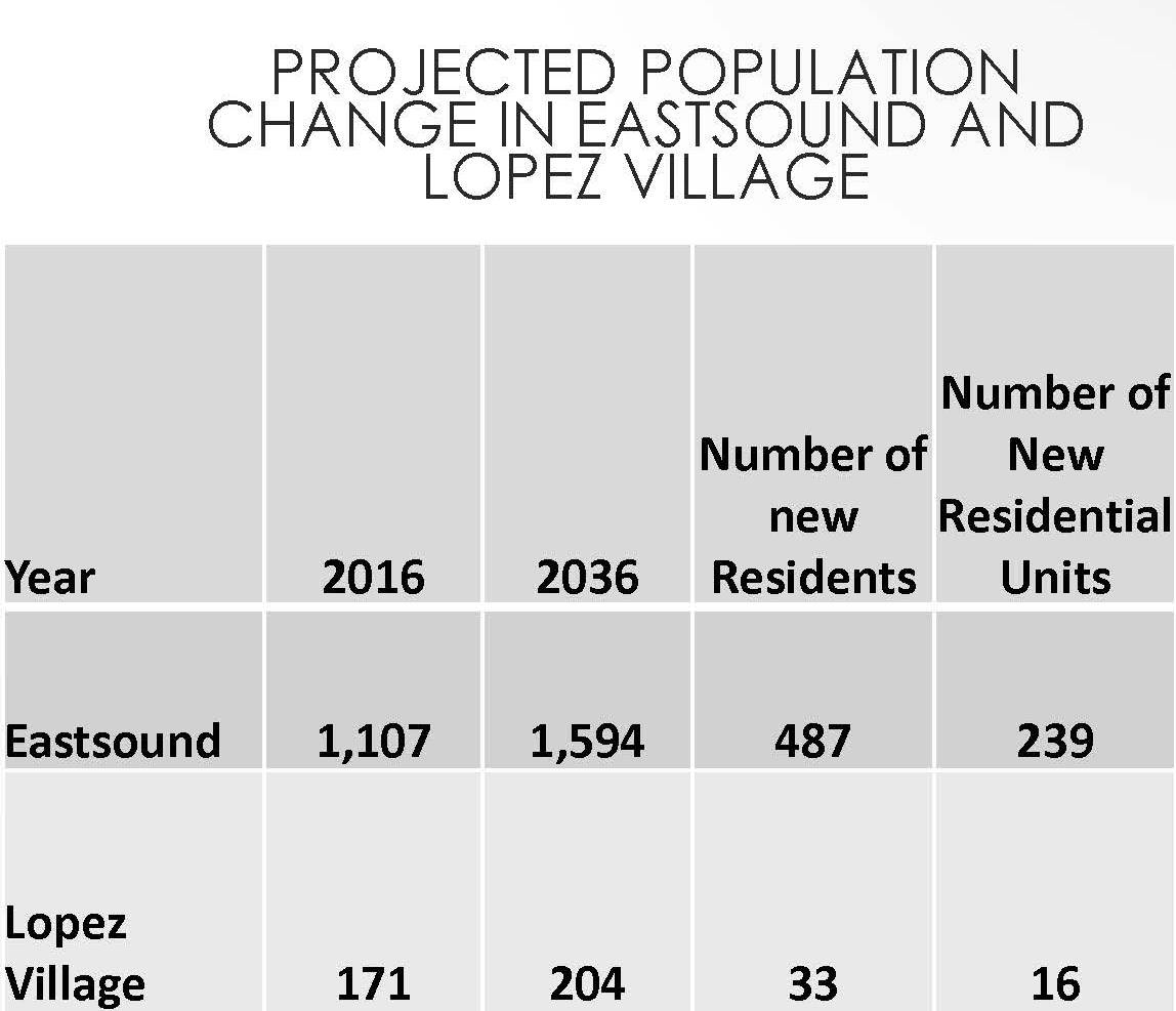 According to community development’s report, by then, the Town of Friday Harbor will have 902 new residents and 442 new residential units. Eastsound is projected to have 487 new residents and 239 residential units. Lopez Village is expected to have 33 new residents and 16 new residential units. The average county household includes two people.