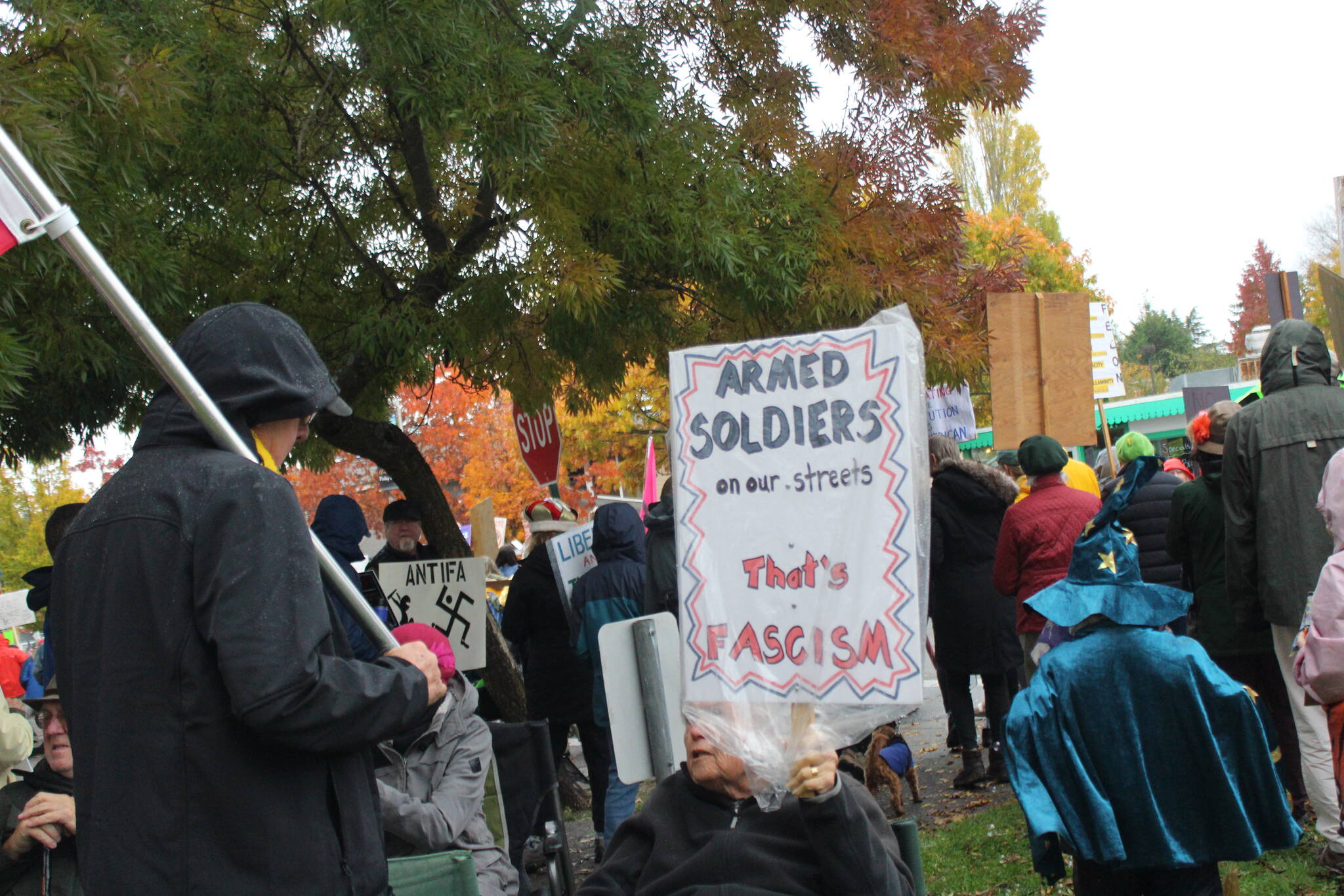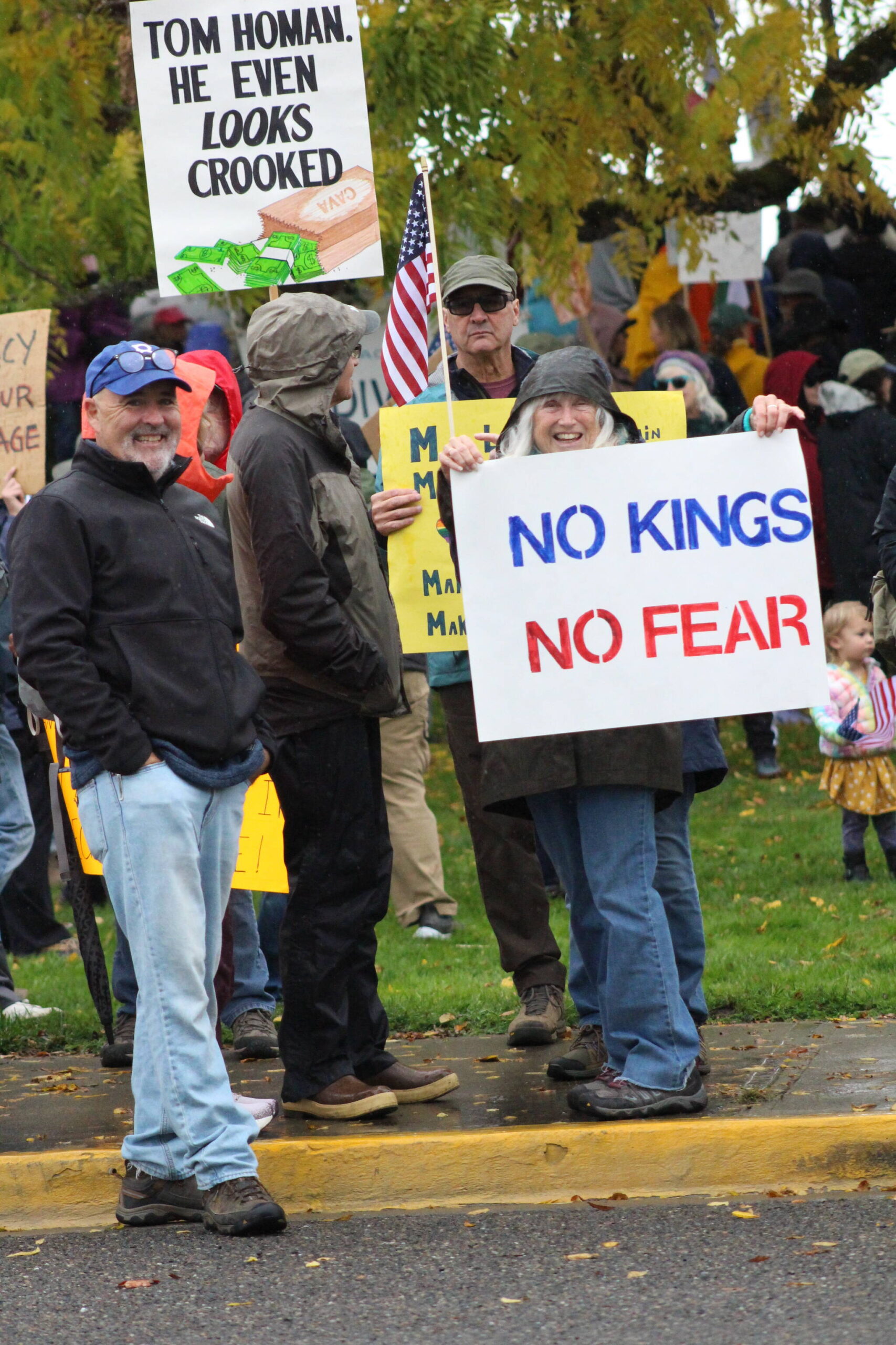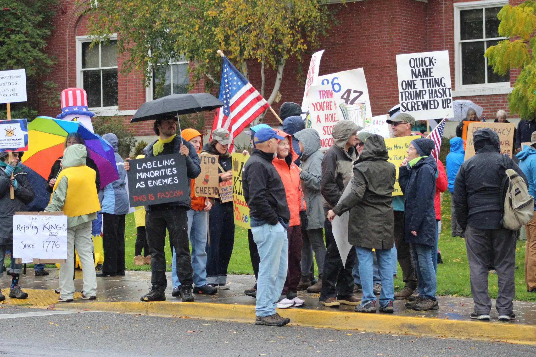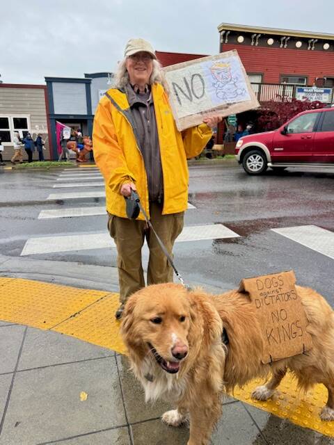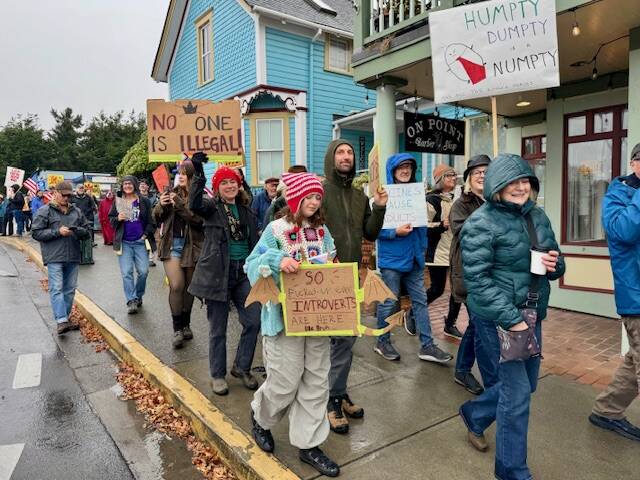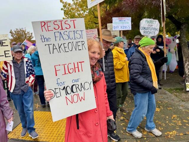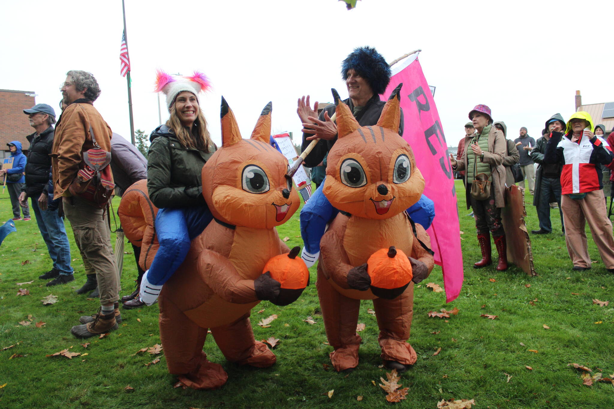 Frogs, squirrels, unicorns, orcas, a T-Rex and a bald eagle dressed in red, white and blue were amongst the over 1,000 No Kings attendees on Oct. 18 in Friday Harbor.