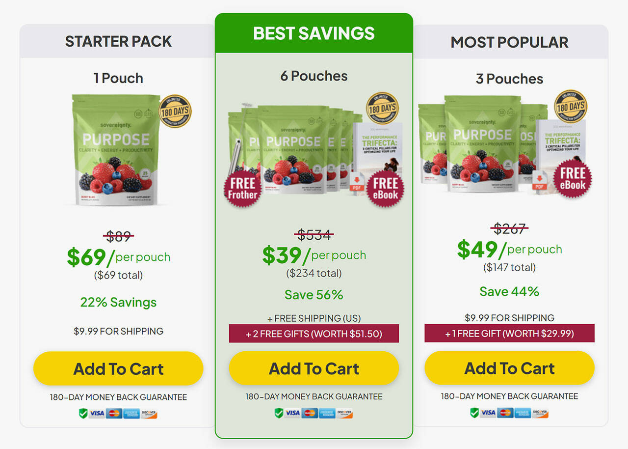 Don’t settle for a life of fatigue and low energy. Take a leap of faith and try Purpose today. It’s not available in stores or on Amazon – the Sovereignty Official page is the only place to get your supply of Purpose.