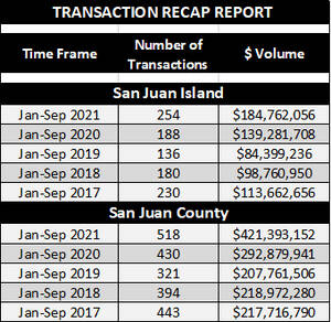 The third-quarter results for San Juan Island and San Juan County were consistent with the first quarter results; very robust. Our market continues to outperform all historic landmarks. Per the NWMLS, the dollar volume year-to-date on San Juan Island was $184,762,056 with a total of 254 transactions. This reflects a 32% increase in the dollar volume and a 34% increase in the number of transactions. For San Juan County, the total dollar volume was $421,393,152 with a total of 518 transactions. The County also had an increase which was 43% in dollar volume and 20% in number of transactions.