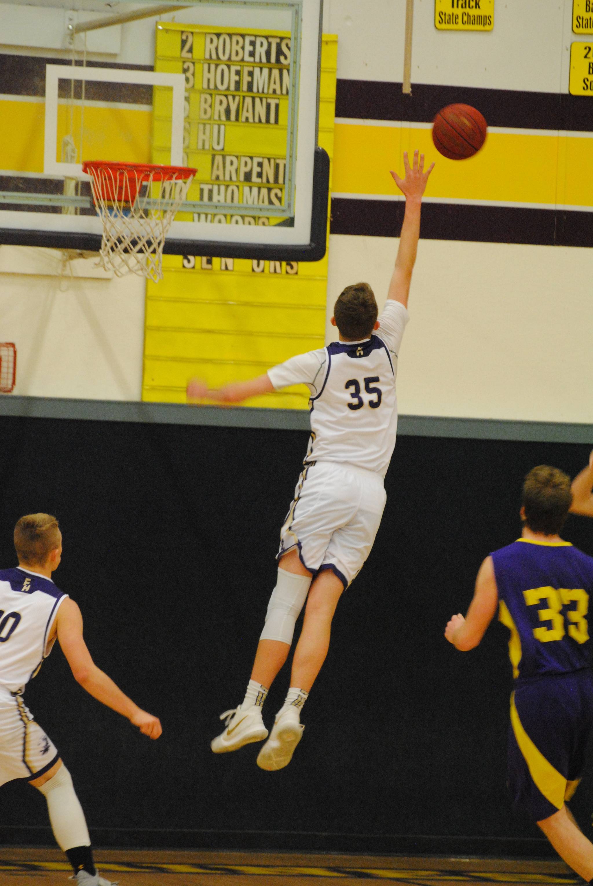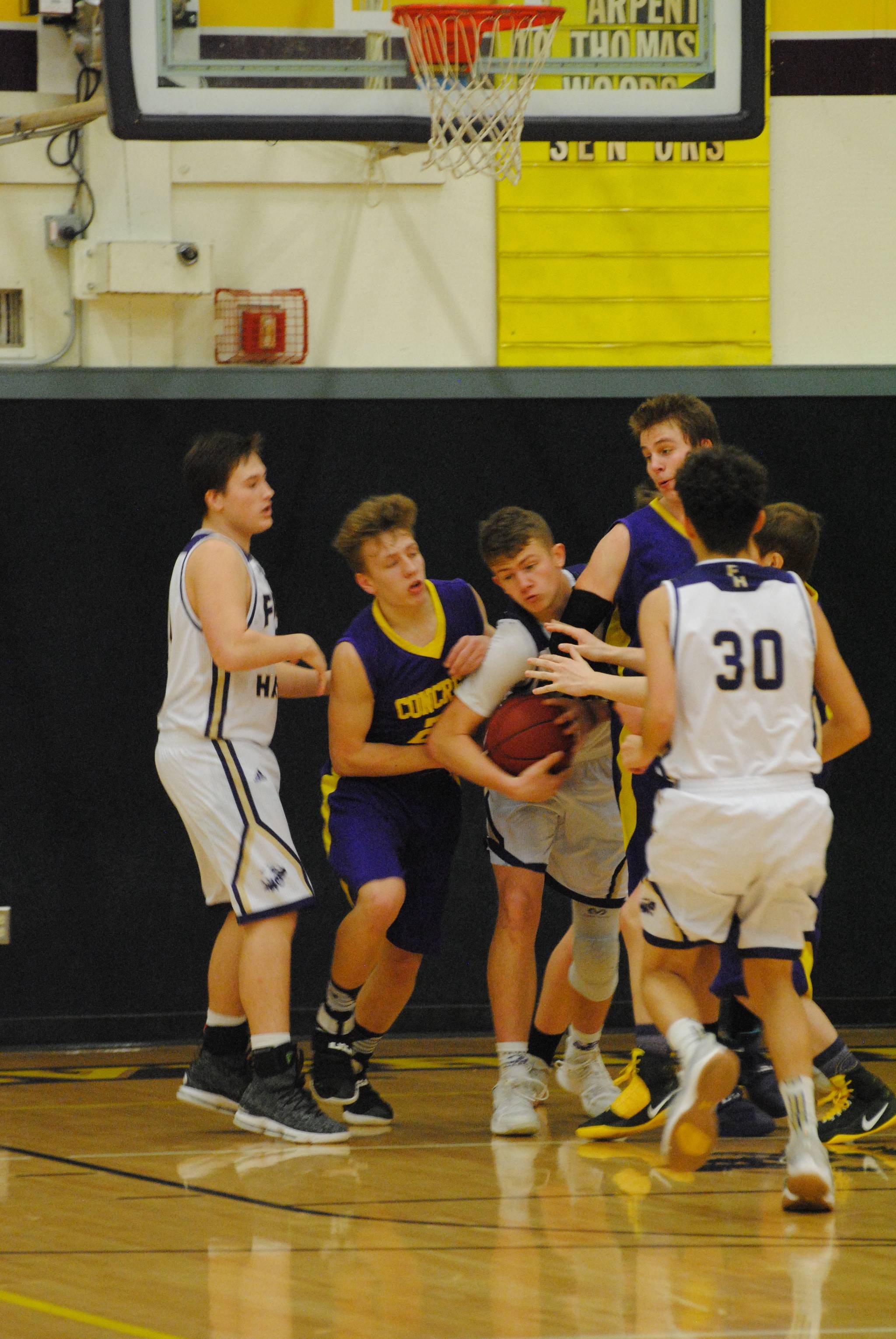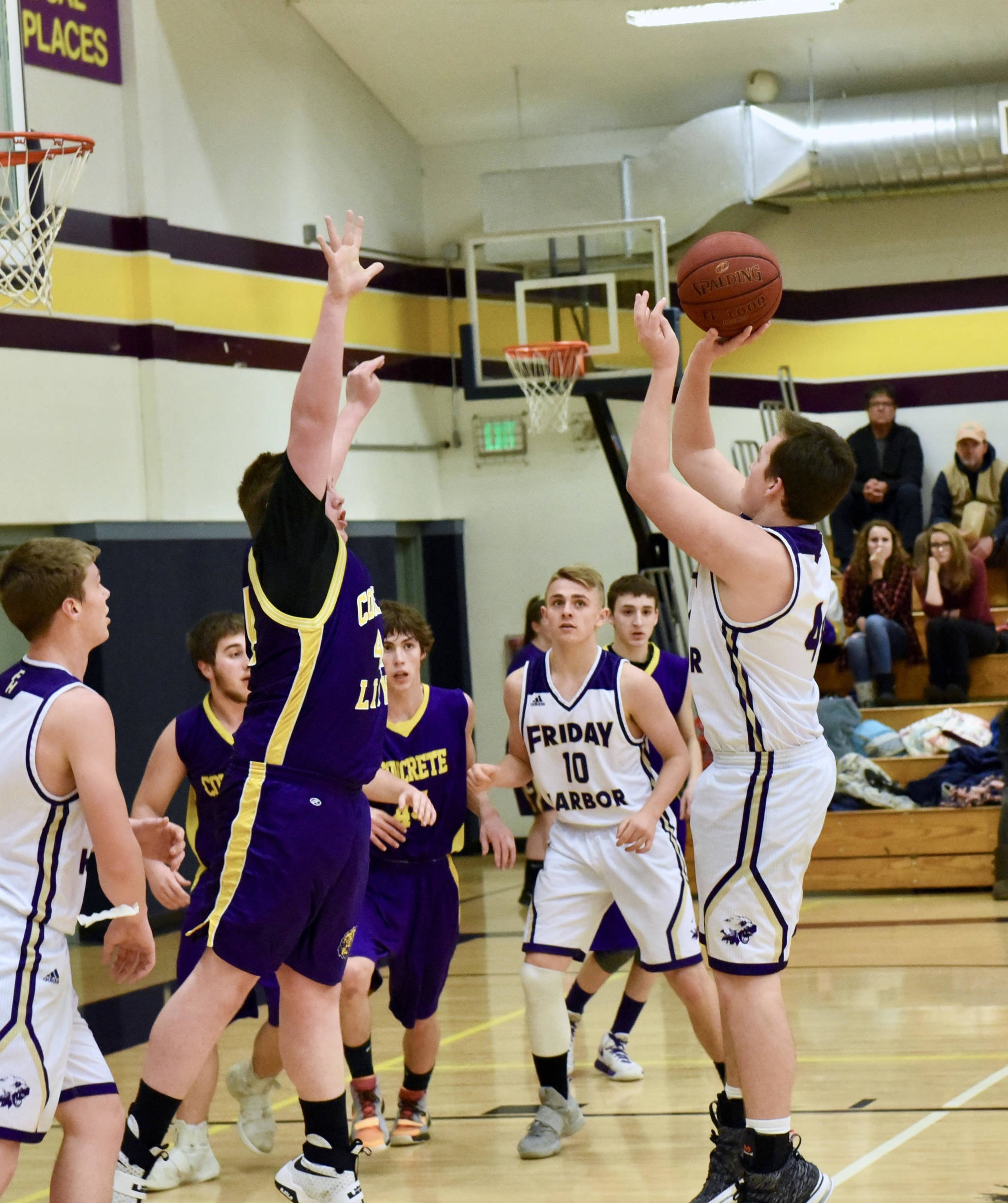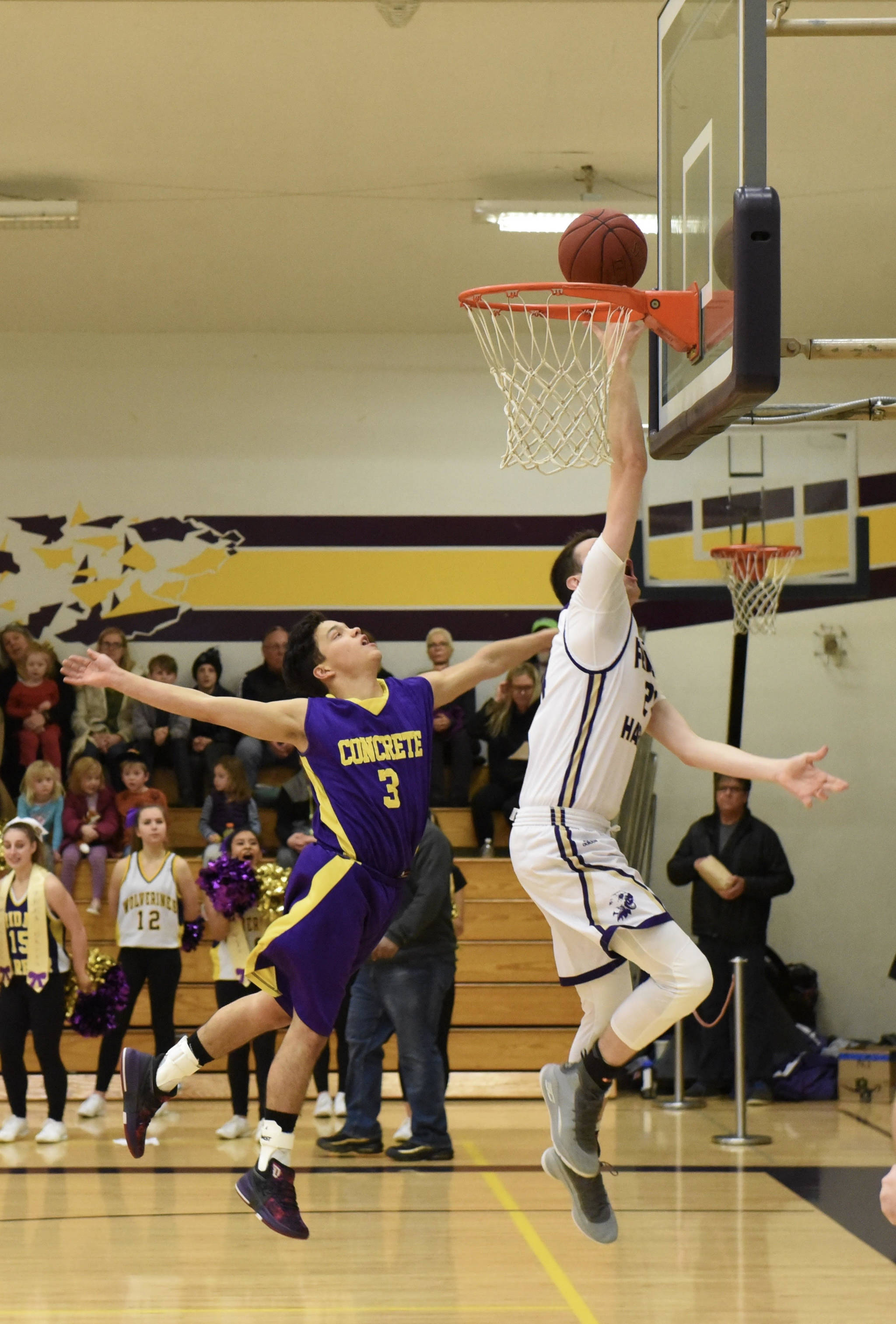 The Concrete Lions were no match for Friday Harbor’s boys basketball team, the Wolverines, at Friday’s game on Feb. 2. This was a change from the last battle against Concrete on Jan. 5, where the Wolverines lost by 1 point, 52-53. This game was the senior night for the Wolverines, which celebrated the two seniors on the team – Isaac Mayer and Rio Black.
