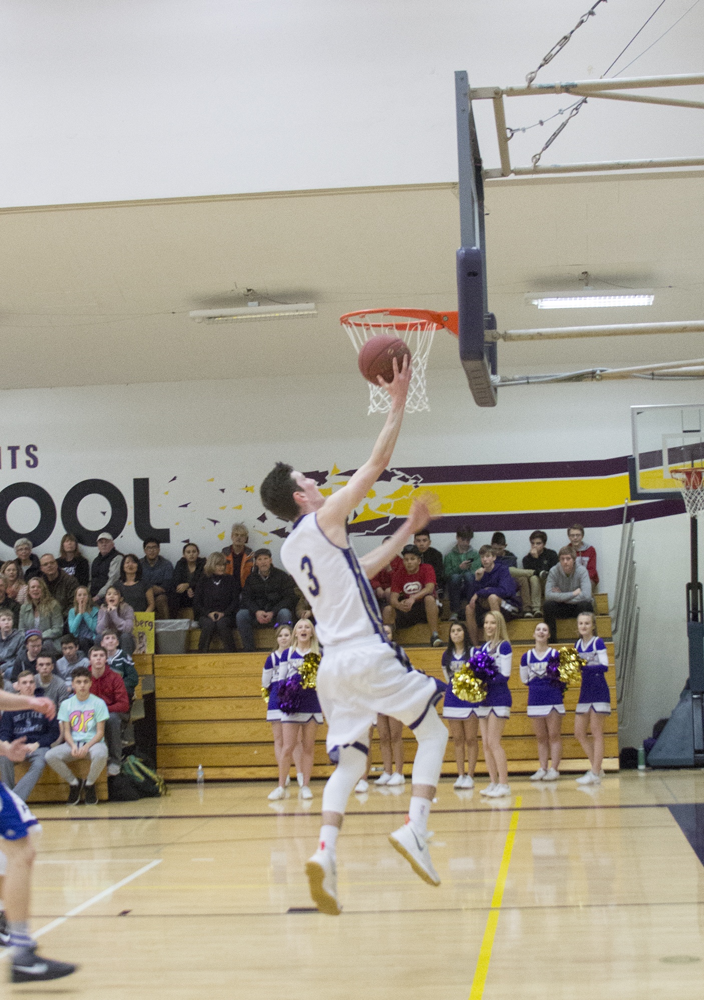 The game was an emotional one for six of the Friday Harbor players. Seniors Eli Cooper-West, Andy Stromberg, Joe Stewart John Gustafson, Jake Lowe, and Simon Vincent were playing their last game at home for Friday Harbor. Joe Stewart put points on the board first with a three-point jump shot that was all net. The Wolverines looked loose and relaxed. They moved the ball well at the perimeter and patiently waited for high percentage shots. Early in the first quarter, Eli Cooper-West took a hard foul under the basket and repaid Mount Vernon by making the two free-throws. The game’s high scorer, John Gustafson, with 14 points, was leading the offense with memorable “no look” passes to his teammates. One of those found Jake Lowe under the basket for a score that drew loud cheers from the packed auditorium. Half way through the second quarter, the score was close and Mount Vernon seemed to be gaining momentum, but Gustafson pulled down a strong offensive rebound and put two points on the board. The scoring was back and forth in the latter part of the second quarter with Gustafson and Cooper-West each scoring to put the team up 26-18 at the half.