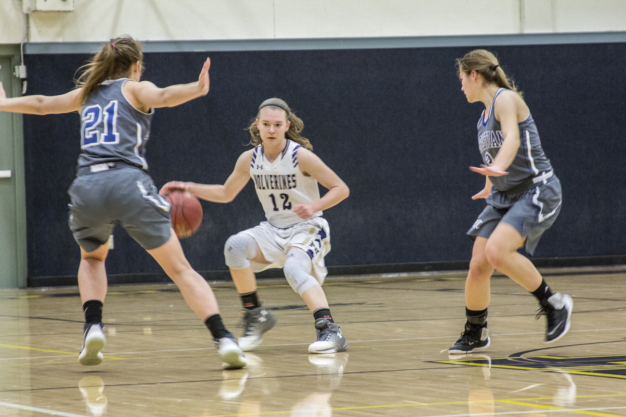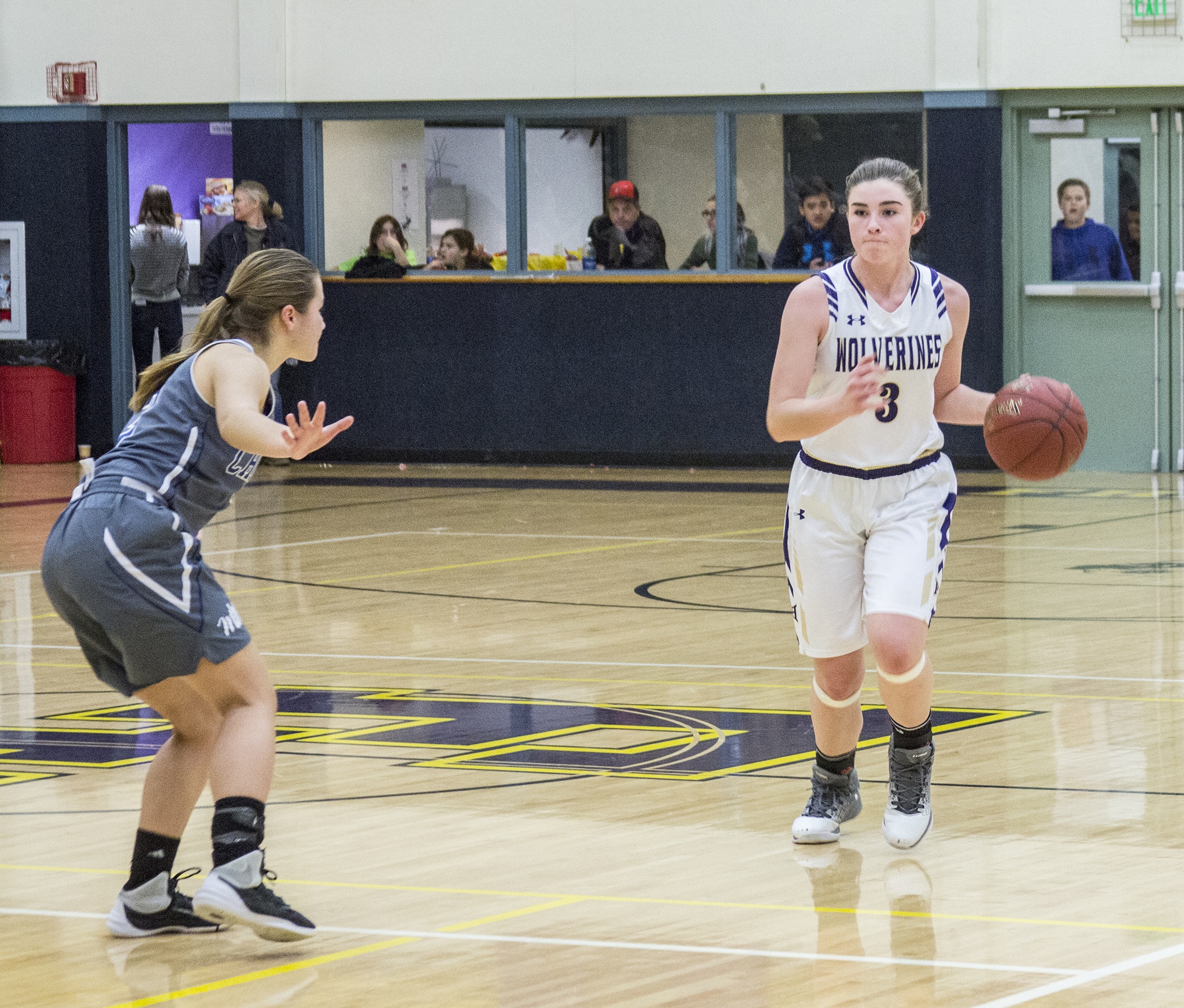 The Wolverine girls were up next, and fought hard but ultimately fell by one point 30-29. Seniors Hannah Hopkins, Hayden Mayer, and Alexa Mora were also playing their last home game. Mount Vernon quickly got on the board first but Hannah Hopkins responded right away with a beautiful outside jump shot from a nicely executed Ciera Bailey pass. Late in the first quarter Kiana Woods hit a three-point shot to put Friday Harbor up, but Mount Vernon responded with a flurry of activity on offense and went up 10-7 at the end of the first quarter.